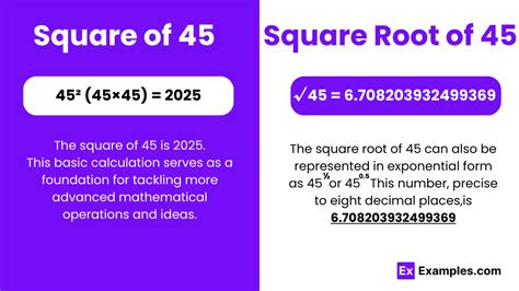 Firstly, let's start with the basics. The square root of a number is simply the value that, when multiplied by itself, gives you the original number. In other words, if we're trying to find the square root of 45, we're looking for a number that, when squared, equals 45. This number is denoted by the symbol √45, where the radical sign (√) represents the square root.